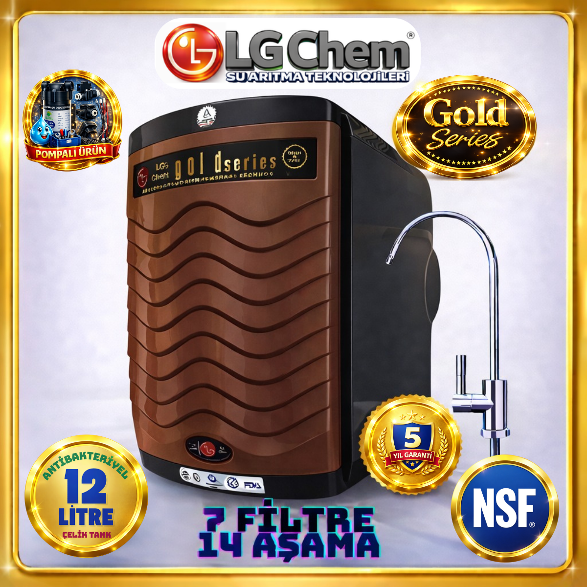 LG Chem markalı 14 aşamalı su arıtma cihazı, ileri filtreleme teknolojisiyle musluk suyunu sağlıklı, berrak ve lezzetli içme suyuna dönüştürür. 12 litre su tankı kapasitesi sayesinde aile kullanımı için ideal olan cihaz, yüksek performanslı filtre sistemi ve uzun ömürlü parçalarıyla güvenilir bir çözüm sunar.